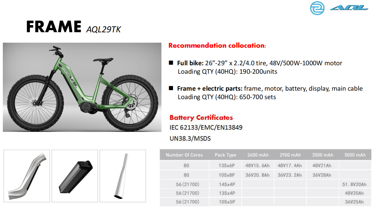 For our new model AQL29TK, we suggest you use 21700 battery cell, because that’s more cost effective for you. Can do 48V 20AH, bigger capacity for customer!