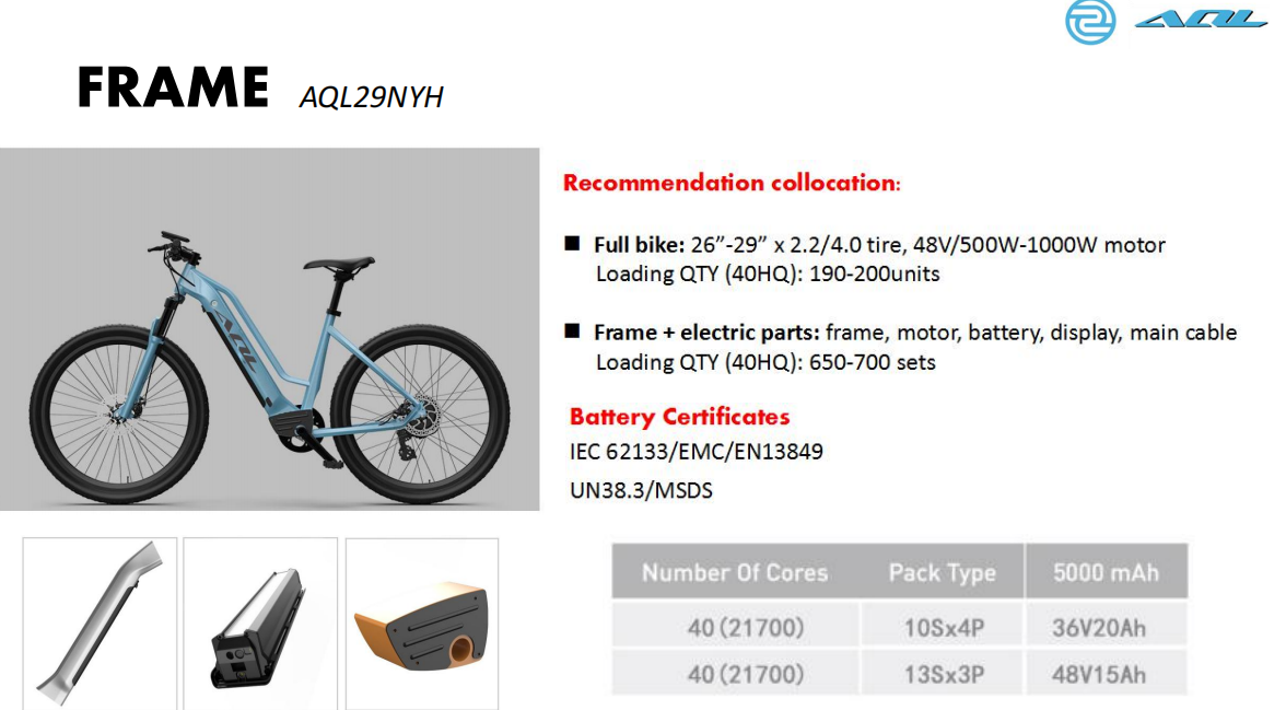 For this model AQL29NYH, usually use 18650 cells, the max capacity is 48V 14AH. But when we use 21700 cells,the capacity can do 48V 15AH, more bigger!
